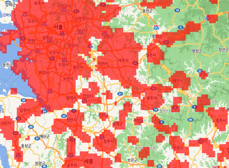 각 통신사는 5G 커버리지 맵 공개를 하고 있습니다. 아래 사이트를 방문하시면 각 통신사 별 5G 속도 지원이 가능한 지역인지 지도상에서 붉게 물든 지점들을 보고 간단히 확인이 가능합니다.