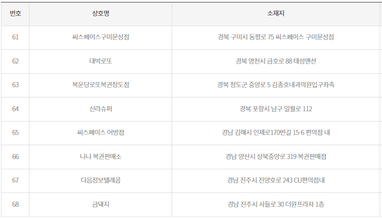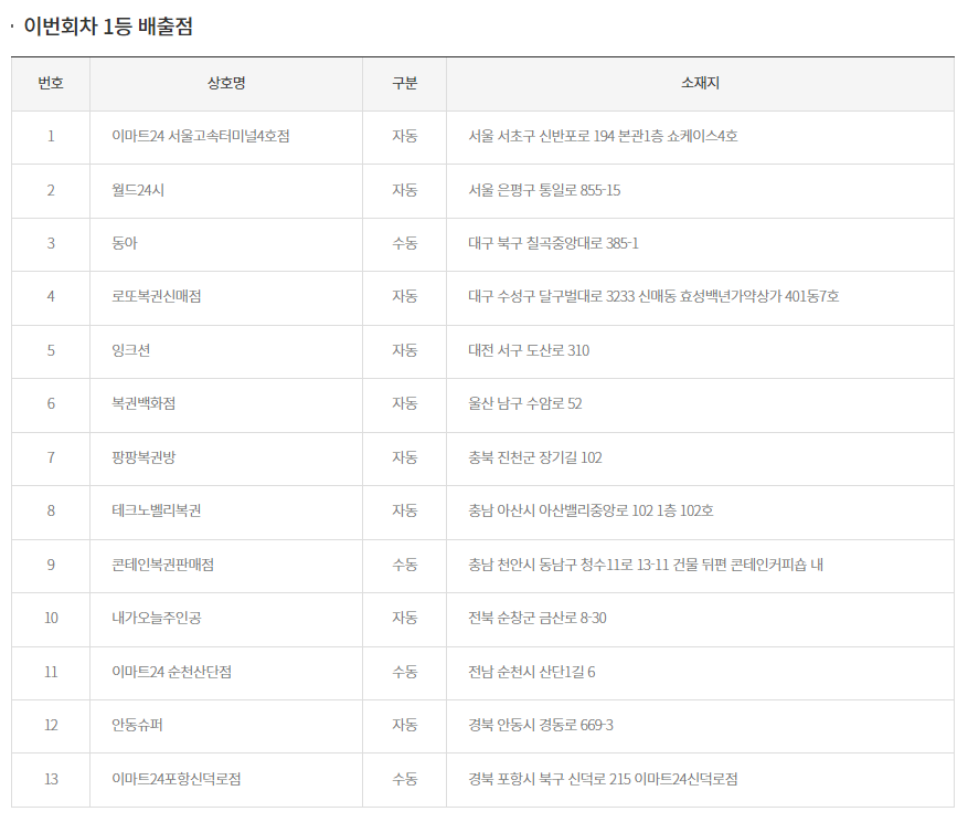 | 로또 당첨번호 조회 1등 당첨지역 등 | 1097회 (0) | 2023.12.09 |