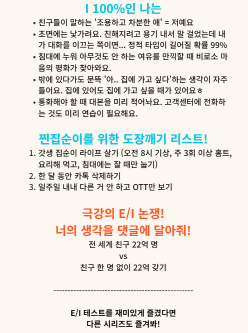MBTI 성격 유형 중 가장 앞부분은 내향과 외향을 결정짓는 I 혹은 E인데요, 이를 두고 흔히 인싸와 아싸를 가르는 유형이라고 하죠. 여러분은 인싸인가요, 아싸(아웃사이더의 줄임말)인가요? 혹은 인싸 중의 아싸인가요, 아싸 중의 인싸인가요? 함께 테스트해요!!